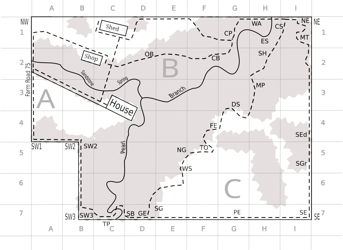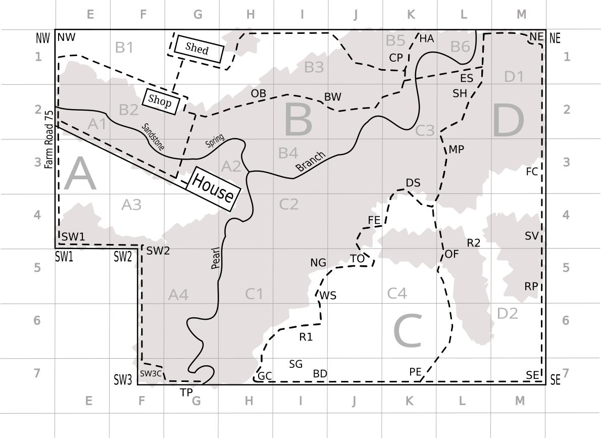 | 2010-02-28 | Edmond | C | EFGHI567, GHI4, I3, HI12 | Hot | 39 (40 to 38) | 26 (21 to 31) | Edmond, Alex; Edmond, Brian; Edmond, Joseph | Burned upper pastures down to woods in EFGHI567, GI4, and I3. Burned patches in HI12. | ||||